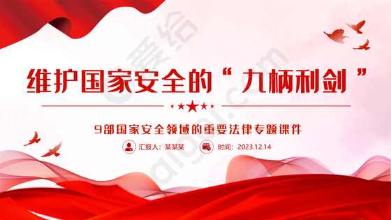爱给网提供海量的PPT资源素材免费下载, 本次作品为pptx 格式的国家安全领域重要法律PPT红色简洁维护国家安全的九柄利剑普法宣传课件, 本站编号78178441, 该PPT素材大小为4m, 该素材已被下载:73次, 更多精彩PPT素材,尽在爱给网。